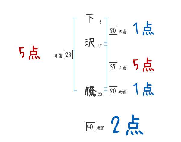 外運![]() | 下沢騰さんの外運は23画の5つ星!想像力に優れ活力がある。一代で成功し名誉を手に入れる。 生活面を象徴する運勢です。外部から受ける影響力を表し、結婚運、家庭運や職場、環境への順応性を表します。 |