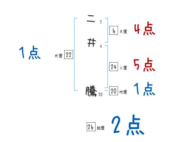 天運![]() | 二井騰さんの天運は6画の4つ星!慎重な努力家で信頼を得る。誠実な精神で向上心に優れる。 家系が持つ宿命的な運勢を表します。祖先から受け継いだ苗字ですので自分の力が及びません。家柄を象徴します。 |