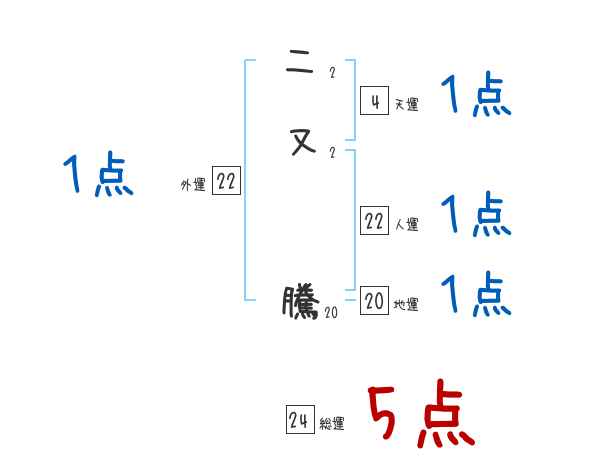 人運![]() | 二又騰さんの人運は22画の1つ星!努力することが苦手ないっぽう手先が器用。芸術性にも優れる。 性格や才能などを表す2番目に重要な運勢です。人間関係や協調性、社会的な成功に影響します。主に20歳から50歳ぐらいまでの中年期の運勢を表します。 |