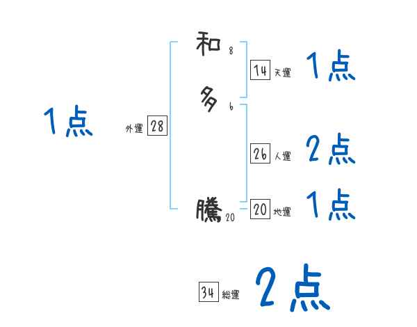 天運![]() | 和多騰さんの天運は14画の1つ星!人に対して優しいがストレスを溜め込みがち。人間関係のトラブルを避けるよう気をつけましょう。 家系が持つ宿命的な運勢を表します。祖先から受け継いだ苗字ですので自分の力が及びません。家柄を象徴します。 |