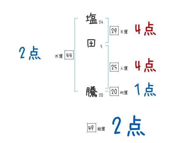 外運![]() | 塩田騰さんの外運は44画の2つ星!誠実で慎重な性格。物事を考えすぎないように注意しましょう。 生活面を象徴する運勢です。外部から受ける影響力を表し、結婚運、家庭運や職場、環境への順応性を表します。 |