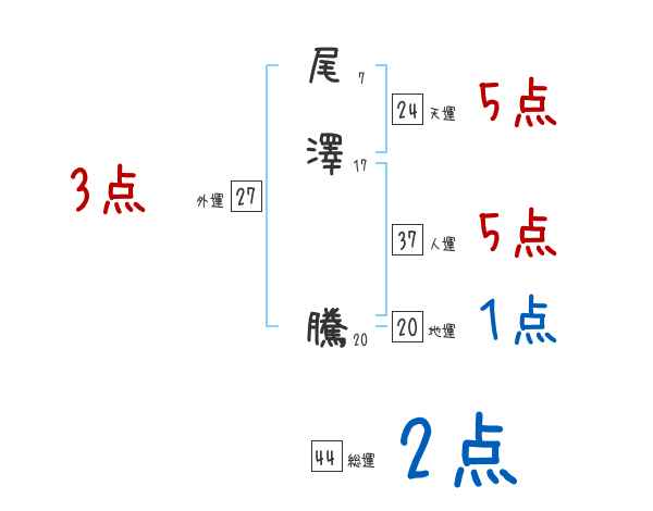 天運![]() | 尾澤騰さんの天運は24画の5つ星!家庭運が良く順調な人生。金運にも恵まれる。 家系が持つ宿命的な運勢を表します。祖先から受け継いだ苗字ですので自分の力が及びません。家柄を象徴します。 |