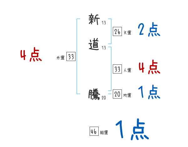 外運![]() | 新道騰さんの外運は33画の4つ星!権力志向でプライドが高い。勇気があり運を切り開き成功する。 生活面を象徴する運勢です。外部から受ける影響力を表し、結婚運、家庭運や職場、環境への順応性を表します。 |