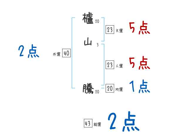 総運![]() | 櫨山騰さんの総運は43画の2つ星!頑固な性格で独立心が強いかも。やや非現実的で浪費に注意しましょう。 あなたの人生を表す1番重要な運勢です。生涯を通じて影響する総合運となり、主に50歳以降の晩年期に影響を及ぼします。 |