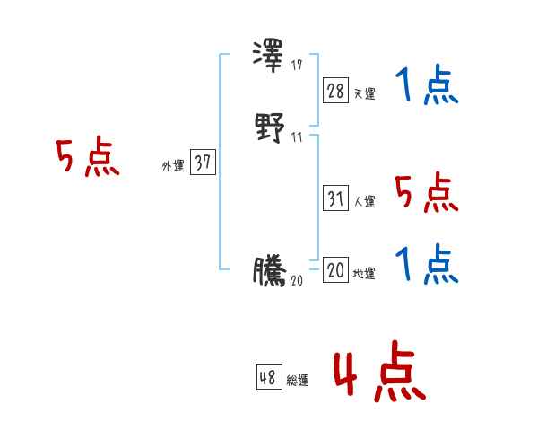 天運![]() | 澤野騰さんの天運は28画の1つ星!家庭環境に注意。スポーツで活躍できる能力があるかも。 家系が持つ宿命的な運勢を表します。祖先から受け継いだ苗字ですので自分の力が及びません。家柄を象徴します。 |