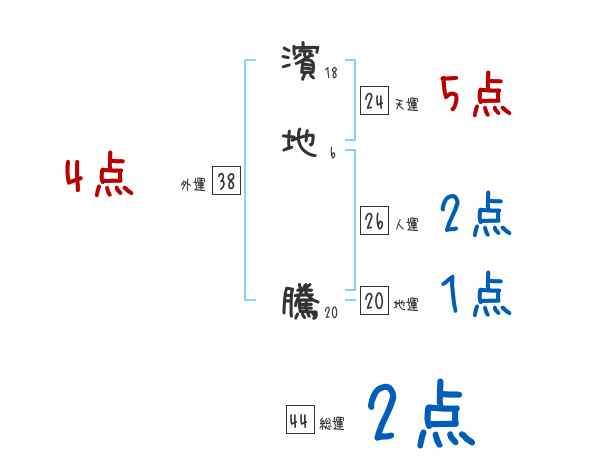 総運![]() | 濱地騰さんの総運は44画の2つ星!誠実で慎重な性格。物事を考えすぎないように注意しましょう。 あなたの人生を表す1番重要な運勢です。生涯を通じて影響する総合運となり、主に50歳以降の晩年期に影響を及ぼします。 |