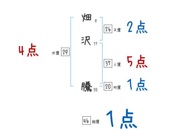 総運![]() | 畑沢騰さんの総運は46画の1つ星!迷走することが多く苦労するかも。目先のことにとらわれないように。 あなたの人生を表す1番重要な運勢です。生涯を通じて影響する総合運となり、主に50歳以降の晩年期に影響を及ぼします。 |