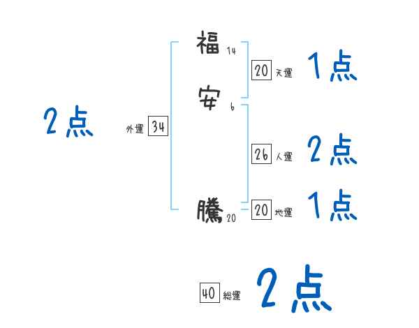 天運![]() | 福安騰さんの天運は20画の1つ星!社交が苦手。人とは違った才能があり波乱万丈な人生かも。 家系が持つ宿命的な運勢を表します。祖先から受け継いだ苗字ですので自分の力が及びません。家柄を象徴します。 |