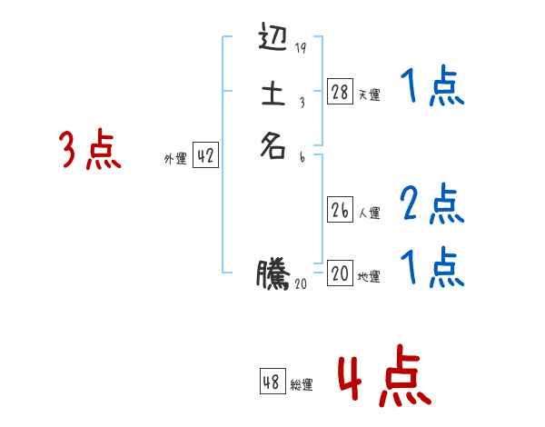 天運![]() | 辺土名騰さんの天運は28画の1つ星!家庭環境に注意。スポーツで活躍できる能力があるかも。 家系が持つ宿命的な運勢を表します。祖先から受け継いだ苗字ですので自分の力が及びません。家柄を象徴します。 |