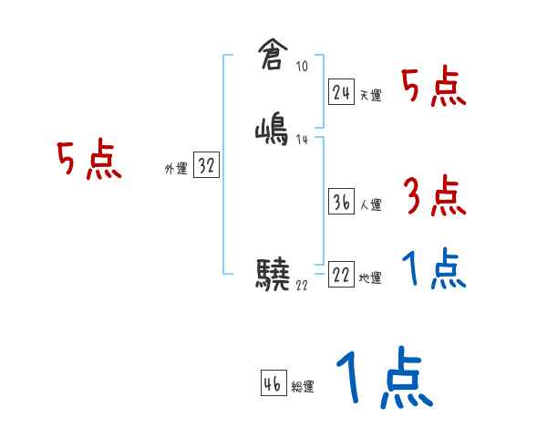 外運![]() | 倉嶋驍さんの外運は32画の5つ星!柔軟性があり成功する。チャンスが多く金運が良い。 生活面を象徴する運勢です。外部から受ける影響力を表し、結婚運、家庭運や職場、環境への順応性を表します。 |