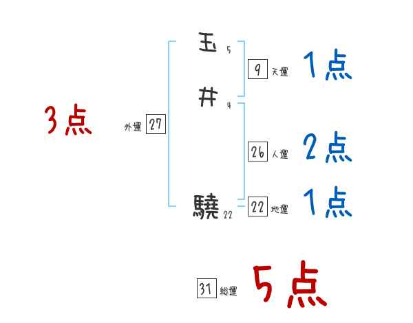 天運![]() | 玉井驍さんの天運は9画の1つ星!消極的で才能を発揮することが苦手なことも。周りの意見に耳を傾けましょう。 家系が持つ宿命的な運勢を表します。祖先から受け継いだ苗字ですので自分の力が及びません。家柄を象徴します。 |