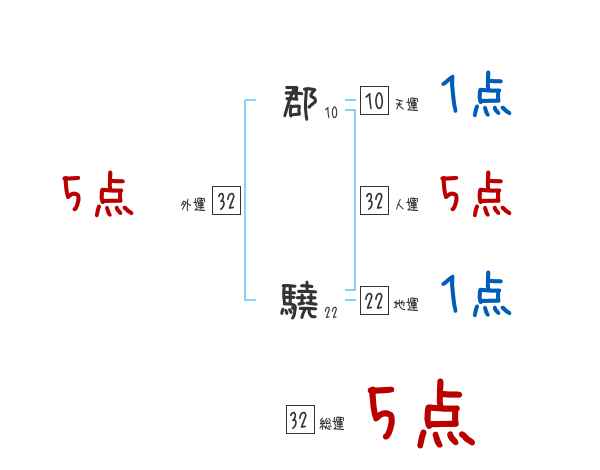 外運![]() | 郡驍さんの外運は32画の5つ星!柔軟性があり成功する。チャンスが多く金運が良い。 生活面を象徴する運勢です。外部から受ける影響力を表し、結婚運、家庭運や職場、環境への順応性を表します。 |