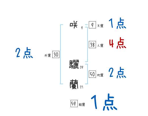 天運![]() | 咲驪蘭さんの天運は9画の1つ星!消極的で才能を発揮することが苦手なことも。周りの意見に耳を傾けましょう。 家系が持つ宿命的な運勢を表します。祖先から受け継いだ苗字ですので自分の力が及びません。家柄を象徴します。 |