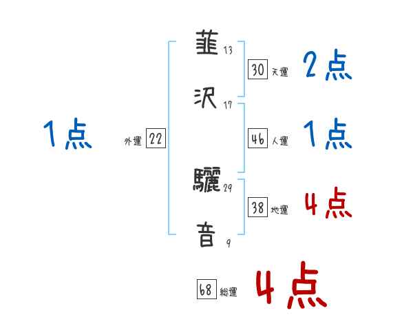 天運![]() | 韮沢驪音さんの天運は30画の2つ星!浮き沈みの激しさに注意しましょう。 家系が持つ宿命的な運勢を表します。祖先から受け継いだ苗字ですので自分の力が及びません。家柄を象徴します。 |