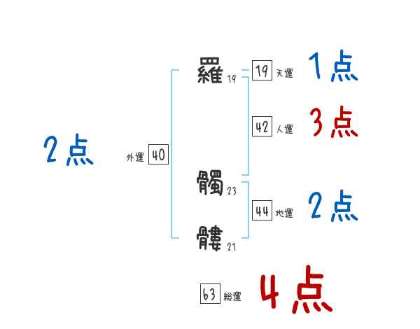 総運![]() | 羅髑髏さんの総運は63画の4つ星!家庭運がよく順調な生活。温和な性格。 あなたの人生を表す1番重要な運勢です。生涯を通じて影響する総合運となり、主に50歳以降の晩年期に影響を及ぼします。 |