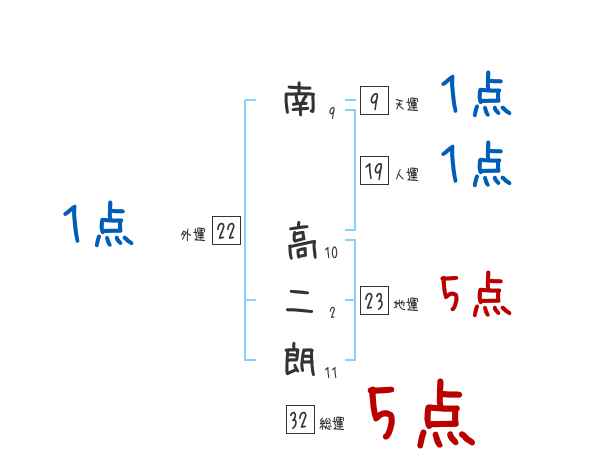 天運![]() | 南高二朗さんの天運は9画の1つ星!消極的で才能を発揮することが苦手なことも。周りの意見に耳を傾けましょう。 家系が持つ宿命的な運勢を表します。祖先から受け継いだ苗字ですので自分の力が及びません。家柄を象徴します。 |