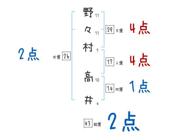 天運![]() | 野々村高井さんの天運は29画の4つ星!完全主義で才能がある。厳格な心の持ち主。 家系が持つ宿命的な運勢を表します。祖先から受け継いだ苗字ですので自分の力が及びません。家柄を象徴します。 |