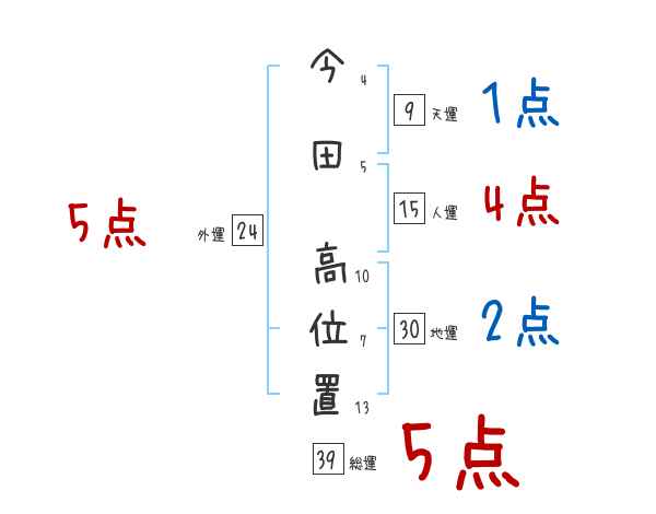 総運![]() | 今田高位置さんの総運は39画の5つ星!社交性に優れ人望が厚い。人の上に立ち成功する。 あなたの人生を表す1番重要な運勢です。生涯を通じて影響する総合運となり、主に50歳以降の晩年期に影響を及ぼします。 |