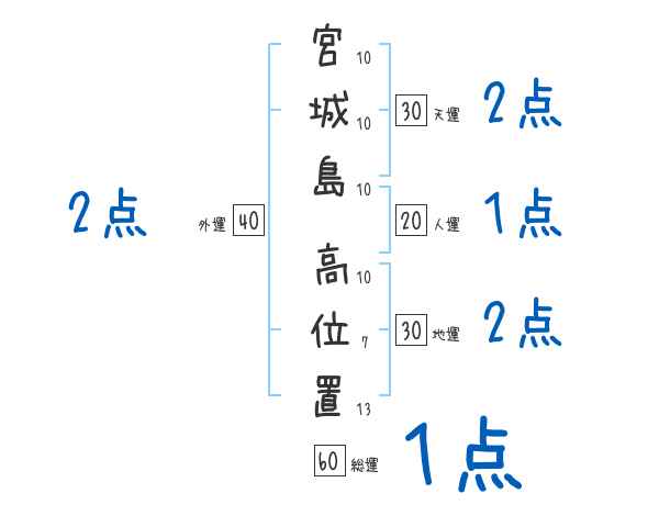 天運![]() | 宮城島高位置さんの天運は30画の2つ星!浮き沈みの激しさに注意しましょう。 家系が持つ宿命的な運勢を表します。祖先から受け継いだ苗字ですので自分の力が及びません。家柄を象徴します。 |