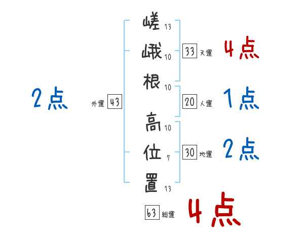 総運![]() | 嵯峨根高位置さんの総運は63画の4つ星!家庭運がよく順調な生活。温和な性格。 あなたの人生を表す1番重要な運勢です。生涯を通じて影響する総合運となり、主に50歳以降の晩年期に影響を及ぼします。 |