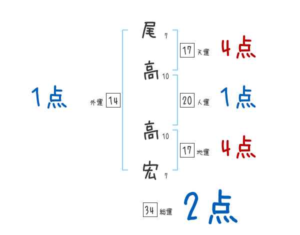 外運![]() | 尾高高宏さんの外運は14画の1つ星!人に対して優しいがストレスを溜め込みがち。人間関係のトラブルを避けるよう気をつけましょう。 生活面を象徴する運勢です。外部から受ける影響力を表し、結婚運、家庭運や職場、環境への順応性を表します。 |