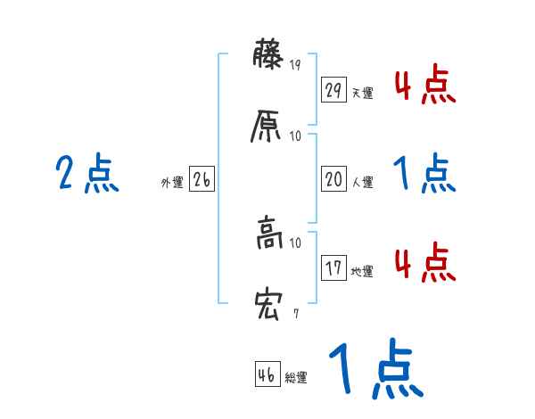 天運![]() | 藤原高宏さんの天運は29画の4つ星!完全主義で才能がある。厳格な心の持ち主。 家系が持つ宿命的な運勢を表します。祖先から受け継いだ苗字ですので自分の力が及びません。家柄を象徴します。 |