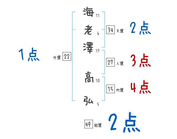 外運![]() | 海老澤高弘さんの外運は22画の1つ星!努力することが苦手ないっぽう手先が器用。芸術性にも優れる。 生活面を象徴する運勢です。外部から受ける影響力を表し、結婚運、家庭運や職場、環境への順応性を表します。 |