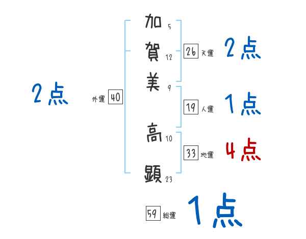 天運![]() | 加賀美高顕さんの天運は26画の2つ星!波瀾万丈かも。信頼できる人を大事にしましょう。 家系が持つ宿命的な運勢を表します。祖先から受け継いだ苗字ですので自分の力が及びません。家柄を象徴します。 |