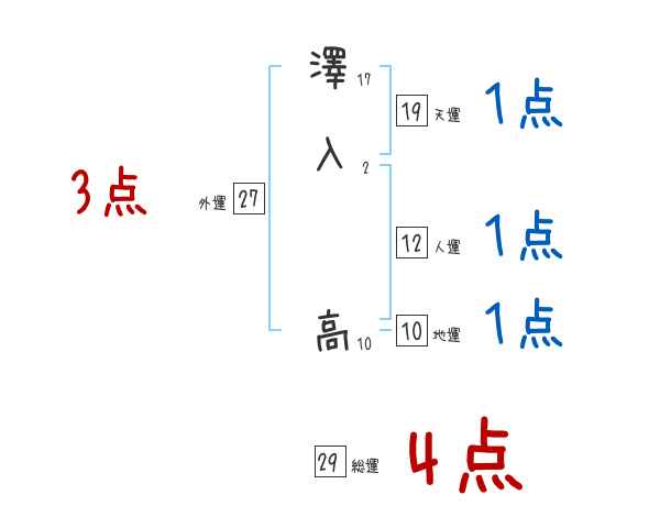 天運![]() | 澤入高さんの天運は19画の1つ星!優れた才能を持ちますが、協調性が足りないことも。周りの人と協力する事を意識しましょう。 家系が持つ宿命的な運勢を表します。祖先から受け継いだ苗字ですので自分の力が及びません。家柄を象徴します。 |