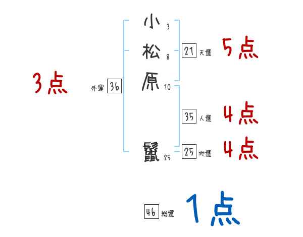 外運![]() | 小松原鬣さんの外運は36画の3つ星!先見性が豊かです。多少神経質で苦労することも。 生活面を象徴する運勢です。外部から受ける影響力を表し、結婚運、家庭運や職場、環境への順応性を表します。 |