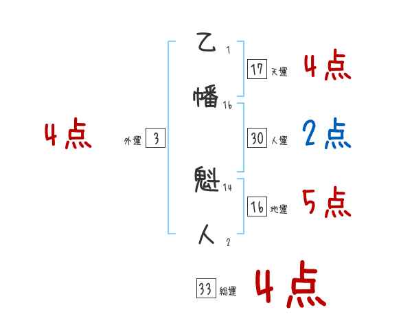 人運![]() | 乙幡魁人さんの人運は30画の2つ星!浮き沈みの激しさに注意しましょう。 性格や才能などを表す2番目に重要な運勢です。人間関係や協調性、社会的な成功に影響します。主に20歳から50歳ぐらいまでの中年期の運勢を表します。 |