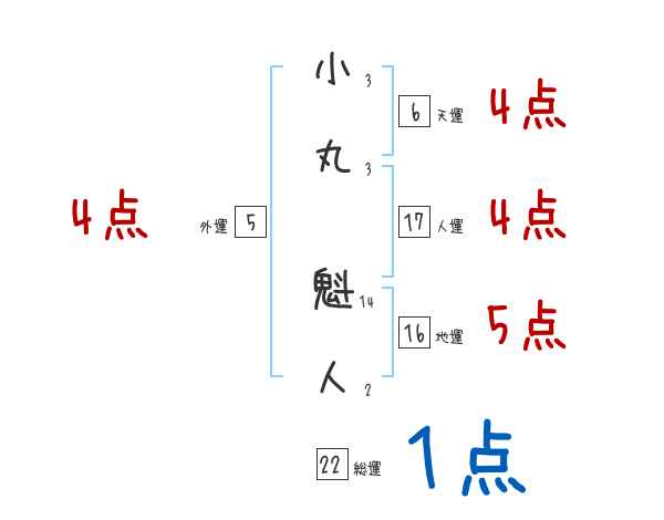 天運![]() | 小丸魁人さんの天運は6画の4つ星!慎重な努力家で信頼を得る。誠実な精神で向上心に優れる。 家系が持つ宿命的な運勢を表します。祖先から受け継いだ苗字ですので自分の力が及びません。家柄を象徴します。 |