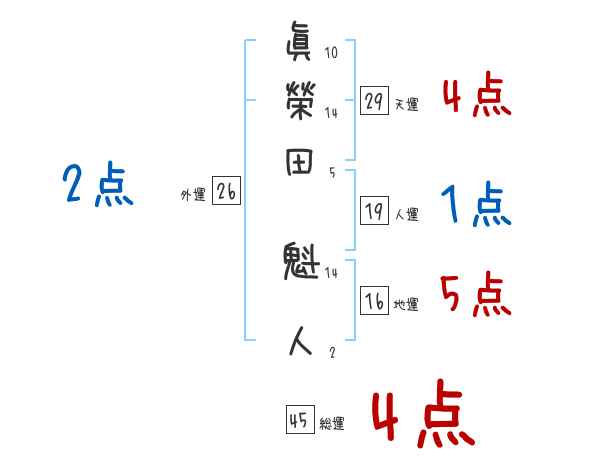 天運![]() | 眞榮田魁人さんの天運は29画の4つ星!完全主義で才能がある。厳格な心の持ち主。 家系が持つ宿命的な運勢を表します。祖先から受け継いだ苗字ですので自分の力が及びません。家柄を象徴します。 |