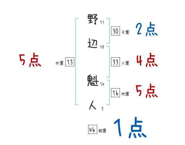 天運![]() | 野辺魁人さんの天運は30画の2つ星!浮き沈みの激しさに注意しましょう。 家系が持つ宿命的な運勢を表します。祖先から受け継いだ苗字ですので自分の力が及びません。家柄を象徴します。 |