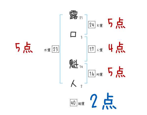 天運![]() | 露口魁人さんの天運は24画の5つ星!家庭運が良く順調な人生。金運にも恵まれる。 家系が持つ宿命的な運勢を表します。祖先から受け継いだ苗字ですので自分の力が及びません。家柄を象徴します。 |