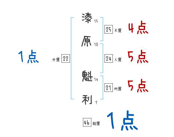 天運![]() | 漆原魁利さんの天運は25画の4つ星!個性があり才能があふれる。強運の持ち主で発展する。 家系が持つ宿命的な運勢を表します。祖先から受け継いだ苗字ですので自分の力が及びません。家柄を象徴します。 |