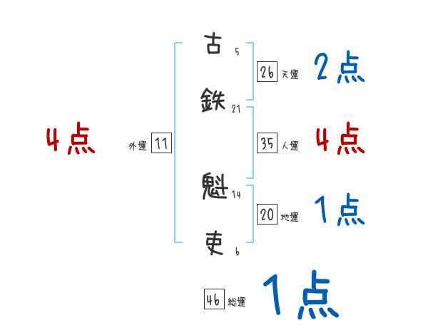 天運![]() | 古鉄魁吏さんの天運は26画の2つ星!波瀾万丈かも。信頼できる人を大事にしましょう。 家系が持つ宿命的な運勢を表します。祖先から受け継いだ苗字ですので自分の力が及びません。家柄を象徴します。 |