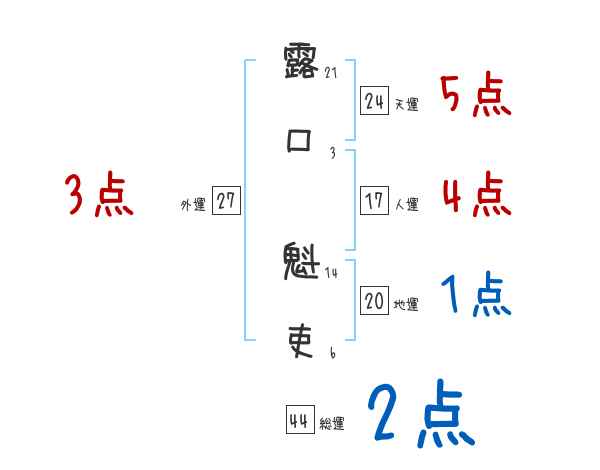 天運![]() | 露口魁吏さんの天運は24画の5つ星!家庭運が良く順調な人生。金運にも恵まれる。 家系が持つ宿命的な運勢を表します。祖先から受け継いだ苗字ですので自分の力が及びません。家柄を象徴します。 |