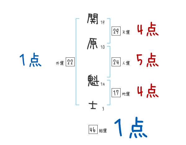 天運![]() | 関原魁士さんの天運は29画の4つ星!完全主義で才能がある。厳格な心の持ち主。 家系が持つ宿命的な運勢を表します。祖先から受け継いだ苗字ですので自分の力が及びません。家柄を象徴します。 |