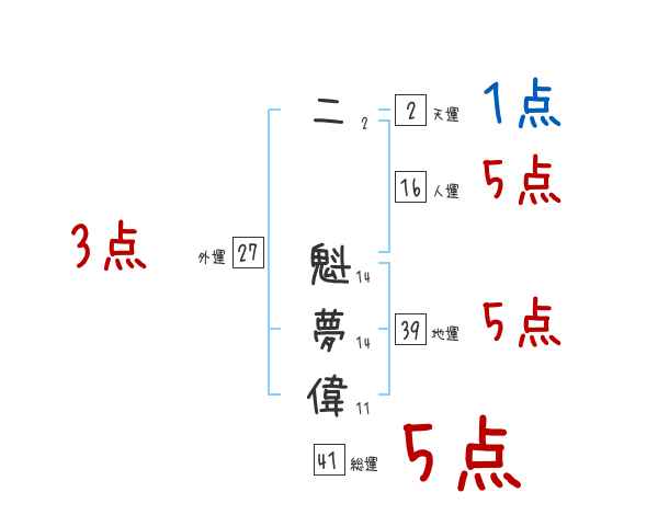 地運![]() | 二魁夢偉さんの地運は39画の5つ星!社交性に優れ人望が厚い。人の上に立ち成功する。 個性を表す基礎的な運勢です。性格形成や対人関係、行動力など家庭環境に影響されます。主に誕生してから20歳くらいまでの若年期の運勢を表します。 |