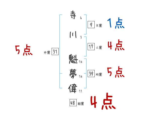 天運![]() | 寺川魁夢偉さんの天運は9画の1つ星!消極的で才能を発揮することが苦手なことも。周りの意見に耳を傾けましょう。 家系が持つ宿命的な運勢を表します。祖先から受け継いだ苗字ですので自分の力が及びません。家柄を象徴します。 |
