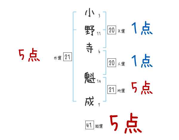 外運![]() | 小野寺魁成さんの外運は21画の5つ星!統率力がある。独立し成功する。名誉を手に入れる。 生活面を象徴する運勢です。外部から受ける影響力を表し、結婚運、家庭運や職場、環境への順応性を表します。 |