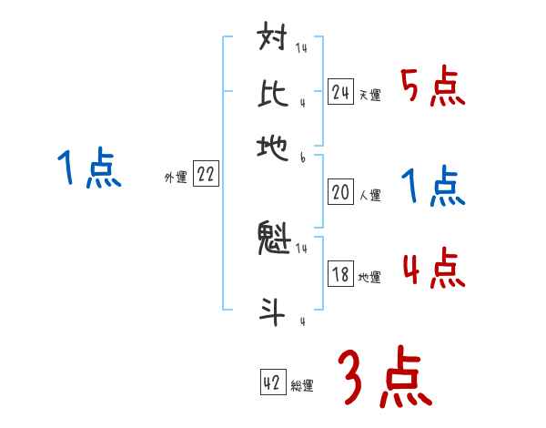 外運![]() | 対比地魁斗さんの外運は22画の1つ星!努力することが苦手ないっぽう手先が器用。芸術性にも優れる。 生活面を象徴する運勢です。外部から受ける影響力を表し、結婚運、家庭運や職場、環境への順応性を表します。 |