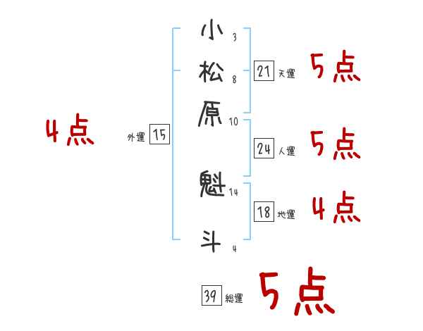 総運![]() | 小松原魁斗さんの総運は39画の5つ星!社交性に優れ人望が厚い。人の上に立ち成功する。 あなたの人生を表す1番重要な運勢です。生涯を通じて影響する総合運となり、主に50歳以降の晩年期に影響を及ぼします。 |