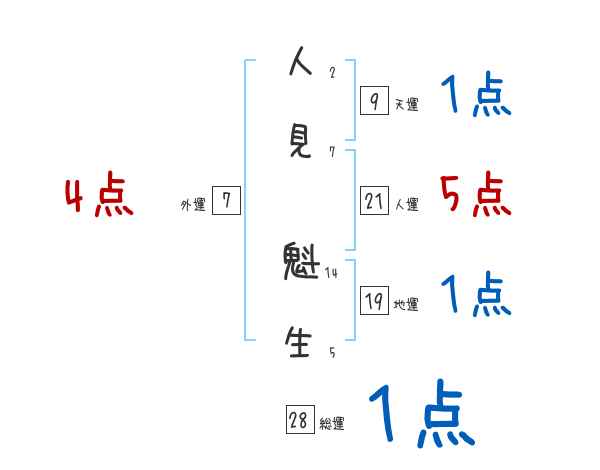 総運![]() | 人見魁生さんの総運は28画の1つ星!家庭環境に注意。スポーツで活躍できる能力があるかも。 あなたの人生を表す1番重要な運勢です。生涯を通じて影響する総合運となり、主に50歳以降の晩年期に影響を及ぼします。 |