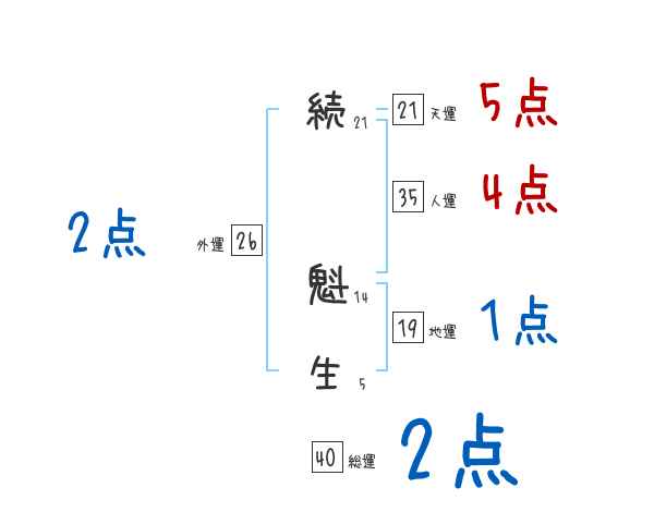 天運![]() | 続魁生さんの天運は21画の5つ星!統率力がある。独立し成功する。名誉を手に入れる。 家系が持つ宿命的な運勢を表します。祖先から受け継いだ苗字ですので自分の力が及びません。家柄を象徴します。 |