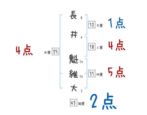 総運![]() | 長井魁維大さんの総運は43画の2つ星!頑固な性格で独立心が強いかも。やや非現実的で浪費に注意しましょう。 あなたの人生を表す1番重要な運勢です。生涯を通じて影響する総合運となり、主に50歳以降の晩年期に影響を及ぼします。 |