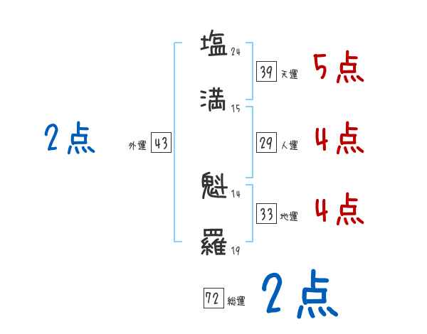 地運![]() | 塩満魁羅さんの地運は33画の4つ星!権力志向でプライドが高い。勇気があり運を切り開き成功する。 個性を表す基礎的な運勢です。性格形成や対人関係、行動力など家庭環境に影響されます。主に誕生してから20歳くらいまでの若年期の運勢を表します。 |