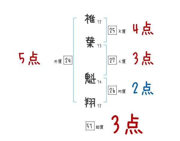 外運![]() | 椎葉魁翔さんの外運は24画の5つ星!家庭運が良く順調な人生。金運にも恵まれる。 生活面を象徴する運勢です。外部から受ける影響力を表し、結婚運、家庭運や職場、環境への順応性を表します。 |