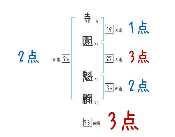 総運![]() | 寺園魁闘さんの総運は53画の3つ星!やや見栄っ張りで虚栄心がある。散財に注意。 あなたの人生を表す1番重要な運勢です。生涯を通じて影響する総合運となり、主に50歳以降の晩年期に影響を及ぼします。 |